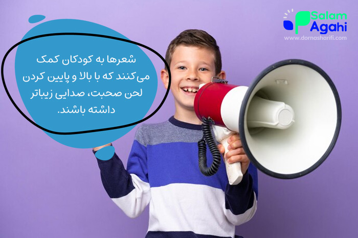 خب، بخش بعدی شعرها و جملاتی هستند برای تقویت فن بیان کودک. این شعرها به کودک در تغییر لحن کمک میکنند. یعنی باعث میشود بتوانند از همین حالا با بالا و پایین کردن لحن صحبت، گفتار و صدای رسا و زیباتری داشته باشند: