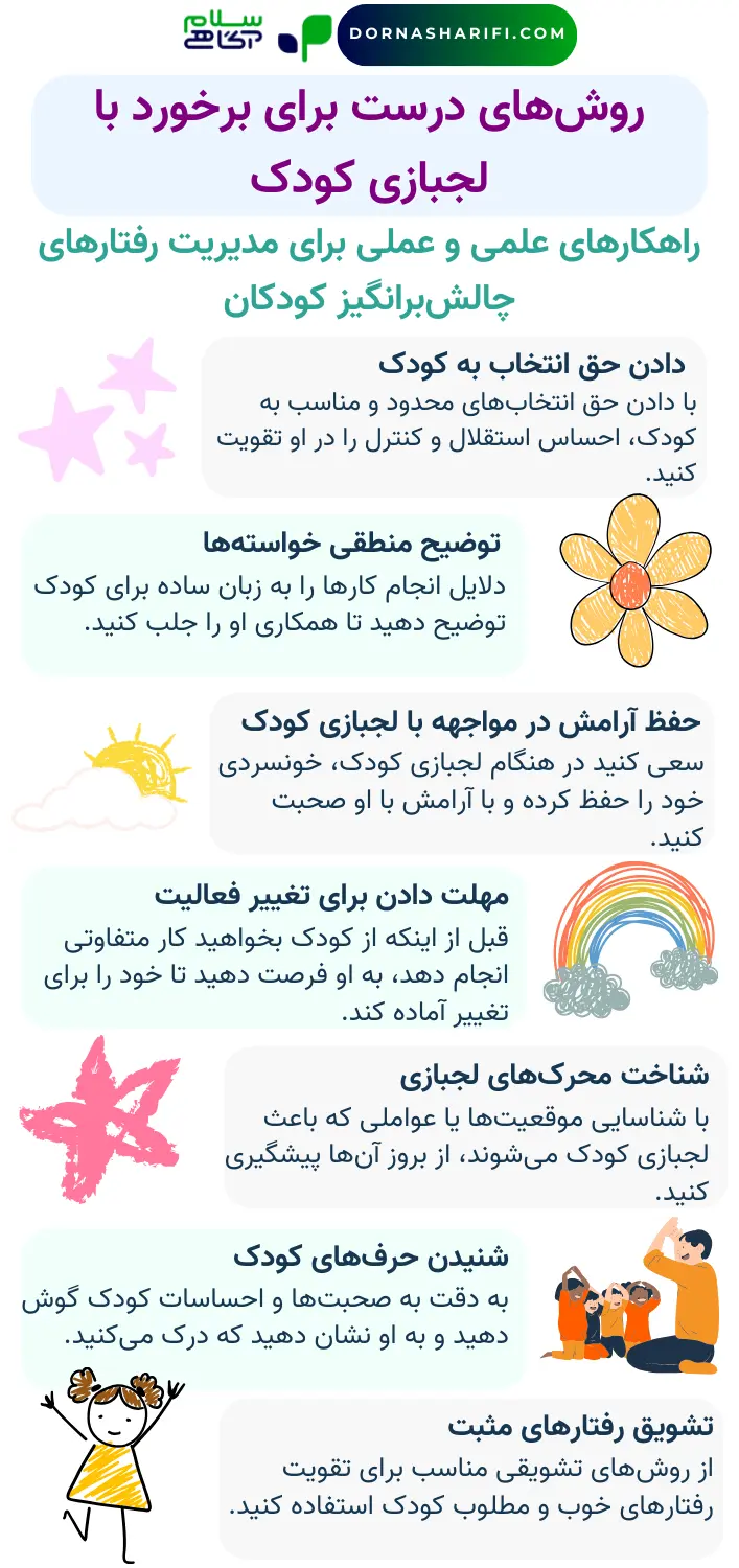| گفتوگو و درک احساسات کودک | گوش دادن به کودک و درک احساسات او، باعث ایجاد رابطهای مثبت میشود که میتواند از میزان لجبازی او کم کند. |