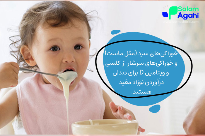 • ماست ساده و سرد: علاوه بر خاصیت تسکین‌دهنده، منبع غنی از کلسیم است که به رشد دندان‌ها کمک می‌کند.