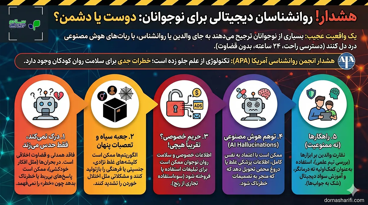 اولین و مهمترین نکتهای که APA روش دست گذاشته، اینه که هوش مصنوعی فاقد “همدلی انسانی” و قضاوت اخلاقیه. ببینید، وقتی نوجوون شما به یه چتبات میگه “دلم گرفته”، اون ربات واقعاً ناراحت نمیشه؛ اون فقط بر اساس میلیونها کلمهای که یاد گرفته، حدس میزنه که کلمه بعدی چی باید باشه. خطرش کجاست؟ ممکنه نوجوون تو یه وضعیت بحرانی باشه (مثلاً افکار خودکشی داشته باشه) و هوش مصنوعی چون درک واقعی از “خطر” نداره، یه جواب بیربط یا حتی تشویقکننده بهش بده! تحقیقات نشون داده بعضی از این مدلها در شرایط حاد، راهکارهای خطرناکی جلوی پای بچه گذاشتن.
